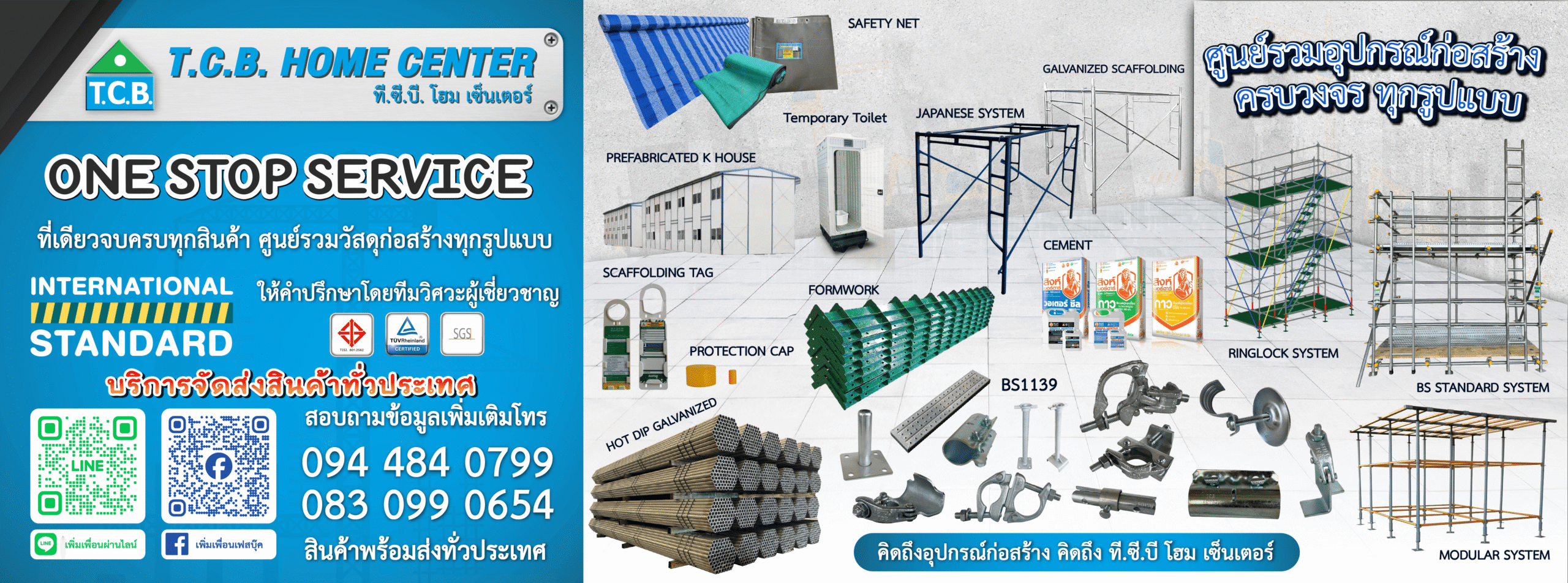 ผลิตและจัดจำหน่ายนั่งร้านและอุปกรณ์ก่อสร้างครบวงจร นั่งร้านทุกรูปแบบ ทั้งนั่งร้านญี่ปุ่น Japanese System นั่งร้าน BS Standard System นั่งร้านลิ่มล็อค Ringlock System นั่งร้านโมดูล่าร์ Modular System และ อุปกรณ์ก่อสร้างทุกชนิด ไม่ว่าจะเป็น ประตูก่อสร้าง รั่วชั่วคราว แบบเหล็กทุกชนิด ออฟฟิศชั่วคราว ป้ายนั่งร้าน ห้องน้ำชั่วคราว ตาข่ายกันฝุ่นรูปแบบต่างๆ อุปกรณ์กันซึมหลายรูปแบบและอีกมากมาย ด้วยคุณภาพของสินค้าและการบริการที่ทุ่มเท คิดถึงนั่งร้าน คิดถึงอุปกรณ์ก่อสร้างแบบครบวงจร ต้อง ที.ซี.บี. โฮม